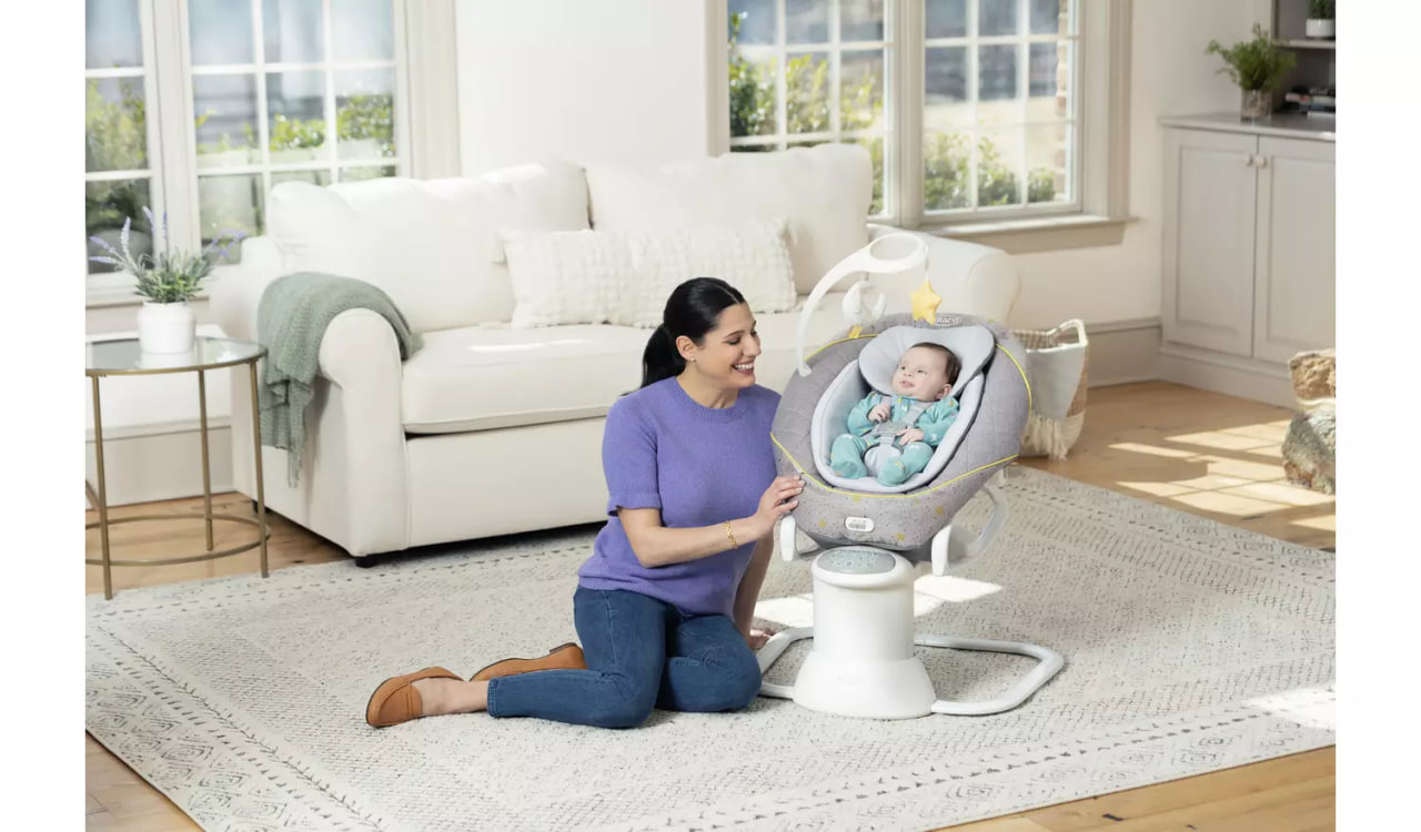 – صندلی تاب‌دار به راحتی به عنوان یک گهواره کودک قابل جابجایی نیز عمل می‌کند تا کودک را در کنار خود در سراسر خانه شاد نگه دارد