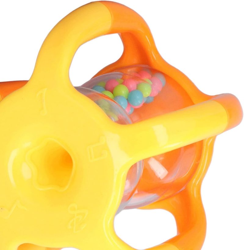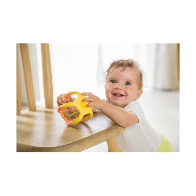 این جغجغه استثنایی را روی زمین بغلتانید تا با حرکتی نرم و چرخشی، صدایی شاد و دلنشین تولید کند! این ویژگی منحصربه‌فرد، توجه نوزاد را به طور کامل جلب می‌کند و او را تشویق می‌کند تا برای تعقیب و گرفتن آن سینه‌خیز برود یا غلت بزند. این اولین گام‌های ارزشمند برای تقویت ماهیچه‌ها و رشد جسمانی اوست!