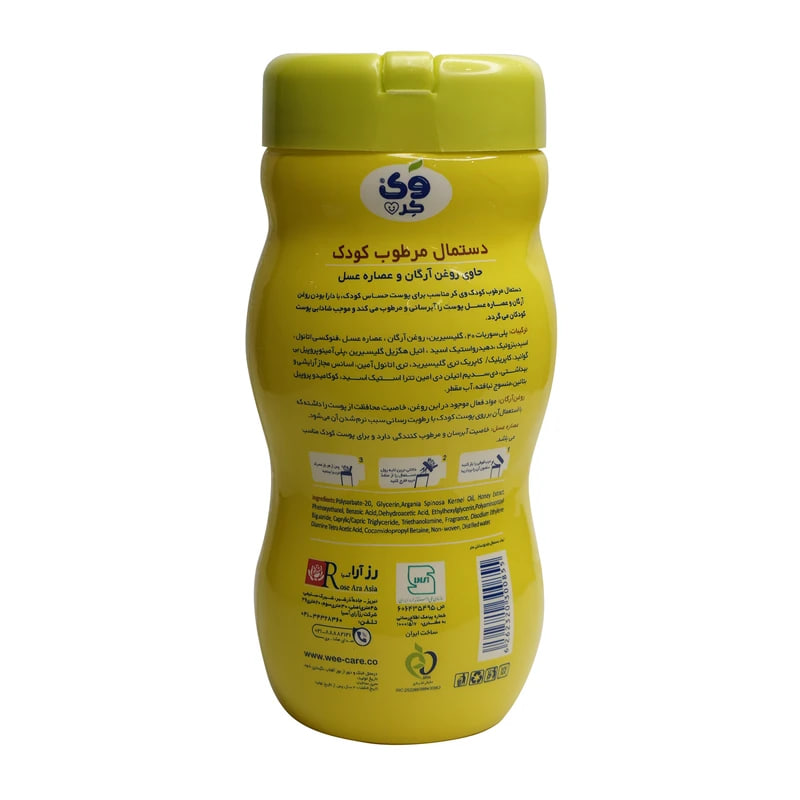 دستمال مرطوب کودک وی کر حاوی روغن آرگان و عصاره عسل با برخورداری از یک لایه نازک روغنی از روغن های معجزه آسای طبیعی، از پوست لطیف کودک مراقبت می نماید. عاری از الکل، پارابن و مواد شیمیایی مضر است. سبک و قابل حمل در کیف است.