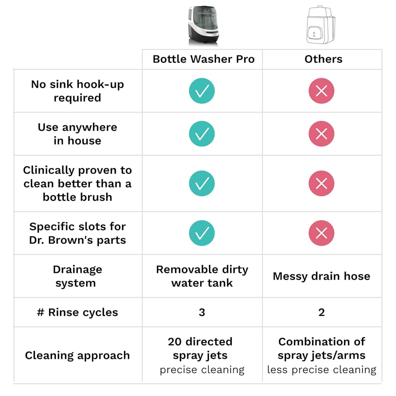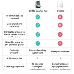 دستگاه شستشوی شیشه شیر پرو می‌تواند تا ۴ شیشه شیر، قطعات شیردوش و لوازم جانبی از هر برندی را در خود جای دهد و نیازی به لوله‌کشی خارجی ندارد، که استفاده از آن را آسان و راحت می‌کند. با برس شیشه شیر سنتی خداحافظی کنید و به تمیز کردن شیشه شیر و لوازم جانبی آن تنها با فشار یک دکمه سلام کنید!