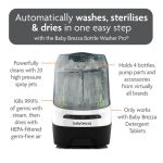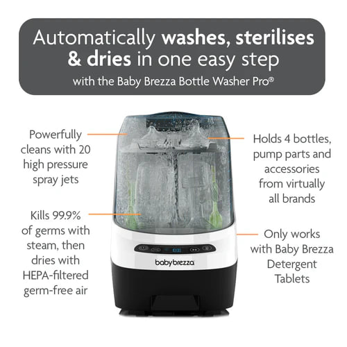 با دستگاه شستشوی شیشه شیر Baby Brezza Pro، آینده تمیز کردن شیشه شیر را تجربه کنید. اولین دستگاهی که به طور خودکار شیشه شیر و لوازم جانبی آن را به صورت یکجا شستشو، استریل و خشک می‌کند. این دستگاه با 20 جت اسپری پرفشار خود، بقایای شیر را به طور قدرتمند از بین می‌برد و تمیز شدن تمام سطوح شیشه شیر، قطعات شیردوش و لوازم جانبی را تضمین می‌کند. همچنین با استفاده از بخار طبیعی، 99.9٪ میکروب‌ها را از بین می‌برد و سپس با هوای گرم بدون میکروب و فیلتر HEPA کاملاً خشک می‌کند.