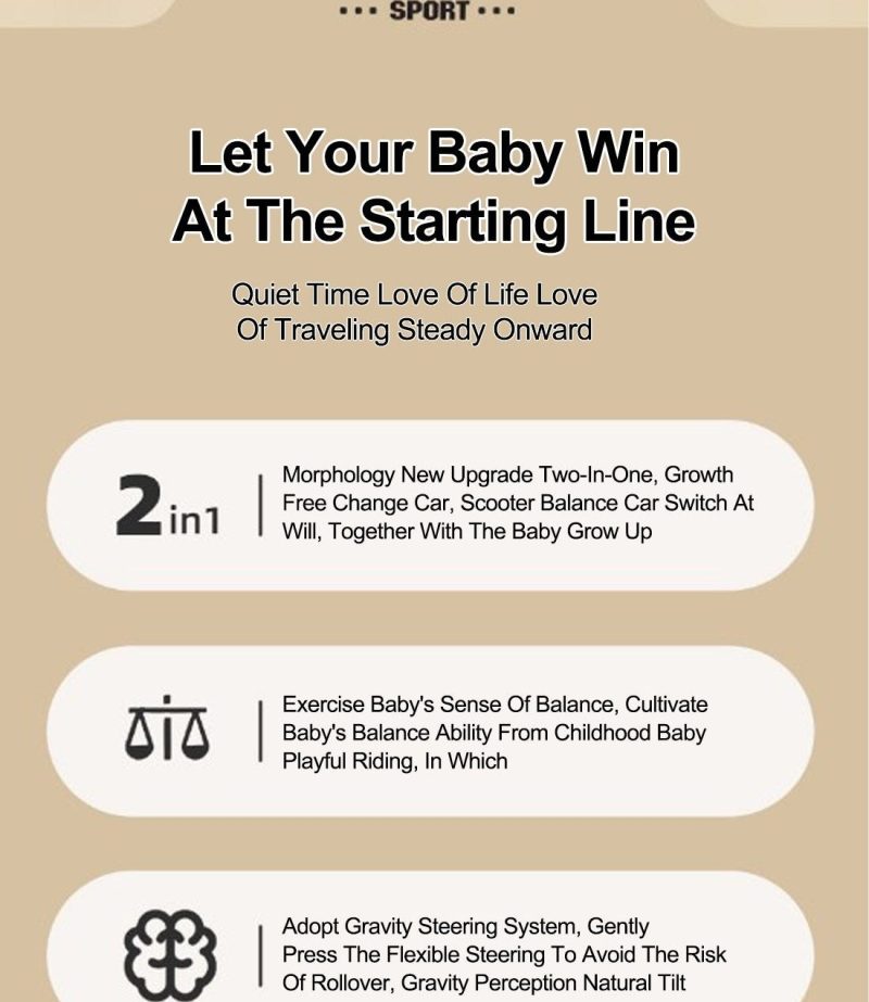 • کودکان 2 تا 4 ساله: پدال چرخ جلو و چرخ های کمکی های چرخ عقب را می توان برای تمرین تعادل کودکان جدا کرد.