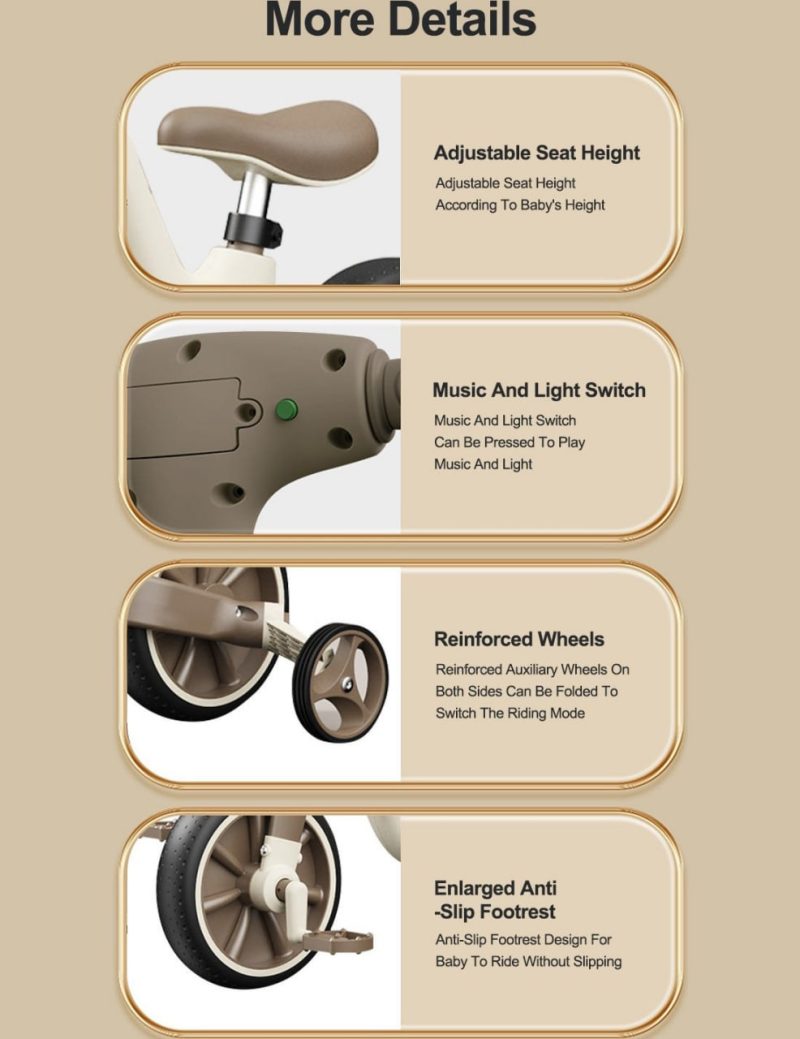 دوچرخه دارای طراحی مدرن است و می توان در 3 حالت مختلف، متناسب برای هر مرحله از رشد کودک از آن استفاده کند. سبک، بادوام، زیبا و پاسخگوی بسیاری از نیازها هستند.
