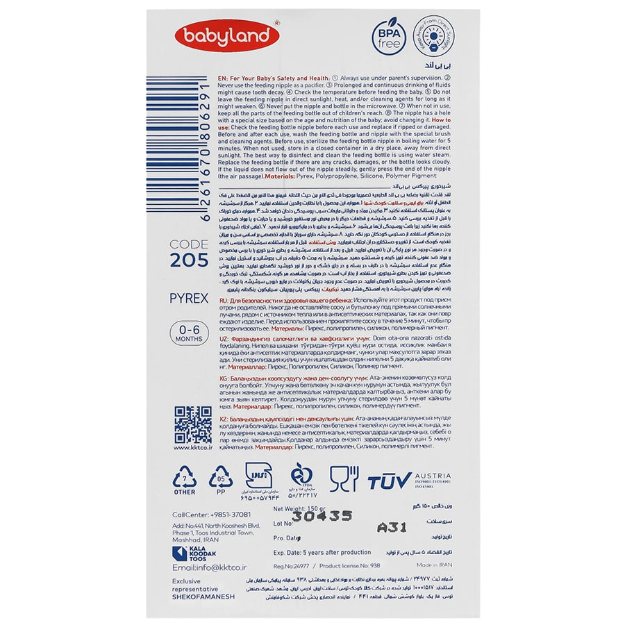 شیشه شیر پیرکس pp نچرال 125 میل بی بی لند کد babyland 205